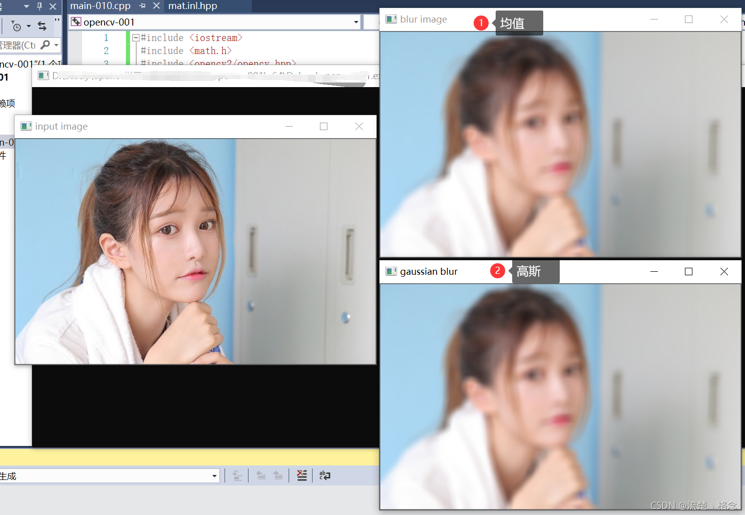 #include <iostream> #include <math.h> #include <opencv2/opencv.hpp> #include<opencv2/highgui.hpp> #include <opencv2/highgui/highgui_c.h> using namespace cv; int main(int argc, char** argv) { Mat src, dst; src = imread("./test2.jpg"); if (!src.data) { printf("could not load image...\n"); return -1; } char input_title[] = "input image"; char output_title[] = "blur image"; namedWindow(input_title, CV_WINDOW_AUTOSIZE); namedWindow(output_title, CV_WINDOW_AUTOSIZE); imshow(input_title, src); blur(src, dst, Size(11, 11), Point(-1, -1)); imshow(output_title, dst); Mat gblur; GaussianBlur(src, gblur, Size(11, 11), 11, 11); imshow("gaussian blur", gblur); waitKey(0); return 0; }