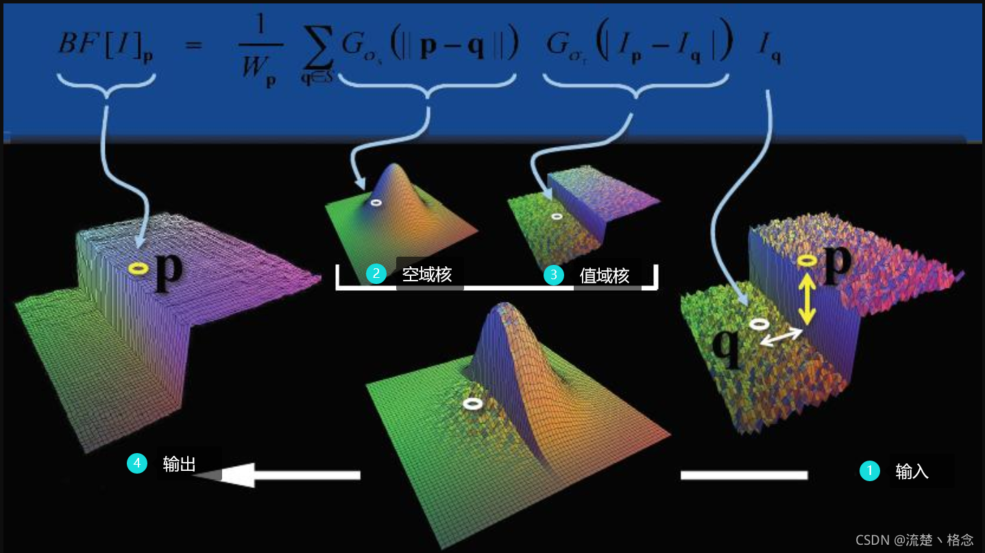 在双边滤波器中,输出像素的值依赖于邻域像素值的加权值组合:
