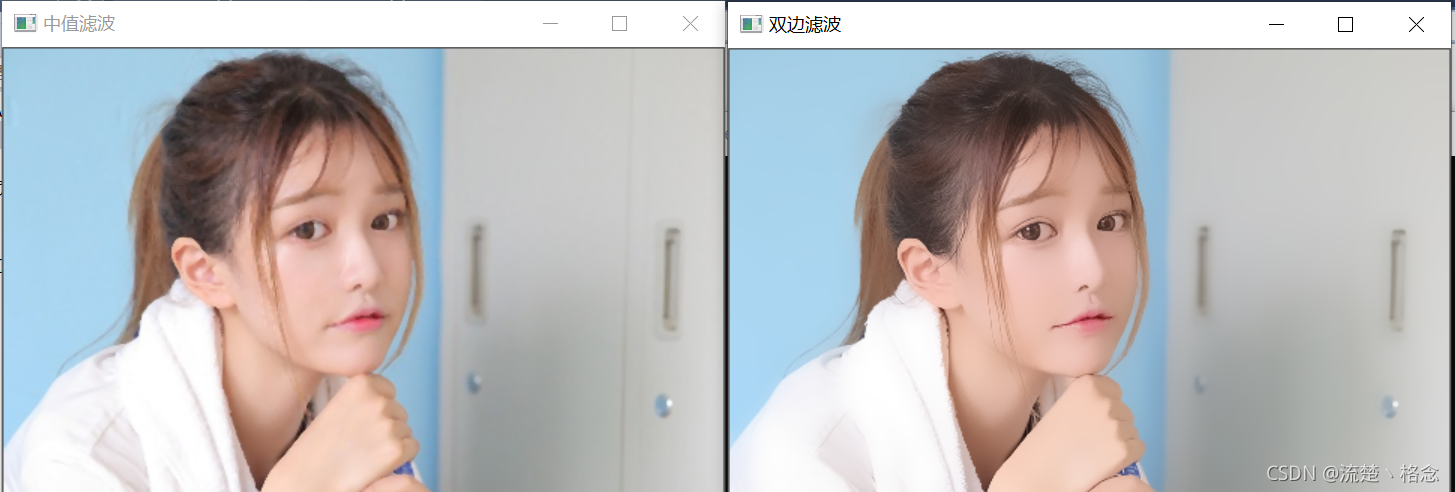#include <iostream> #include <math.h> #include <opencv2/opencv.hpp> #include<opencv2/highgui.hpp> #include <opencv2/highgui/highgui_c.h> using namespace cv; int main() { Mat img = imread("./test2.jpg"); // 据说丑女经过双边滤波用有美颜效果哦,有兴趣的同学可以试试 Mat median_img, bilateral_img; medianBlur(img, median_img, 10); bilateralFilter(img, bilateral_img, 25, 25 * 2, 25 / 2); namedWindow("中值滤波", CV_WINDOW_AUTOSIZE); imshow("中值滤波", median_img); namedWindow("双边滤波", CV_WINDOW_AUTOSIZE); imshow("双边滤波", bilateral_img); waitKey(0); return 0; }