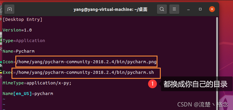 [Desktop Entry] Version=1.0 Type=Application Name=Pycharm Icon=/home/yang/pycharm-community-2018.2.4/bin/pycharm.png Exec=/home/yang/pycharm-community-2018.2.4/bin/pycharm.sh MimeType=application/x-py; Name[en_US]=pycharm