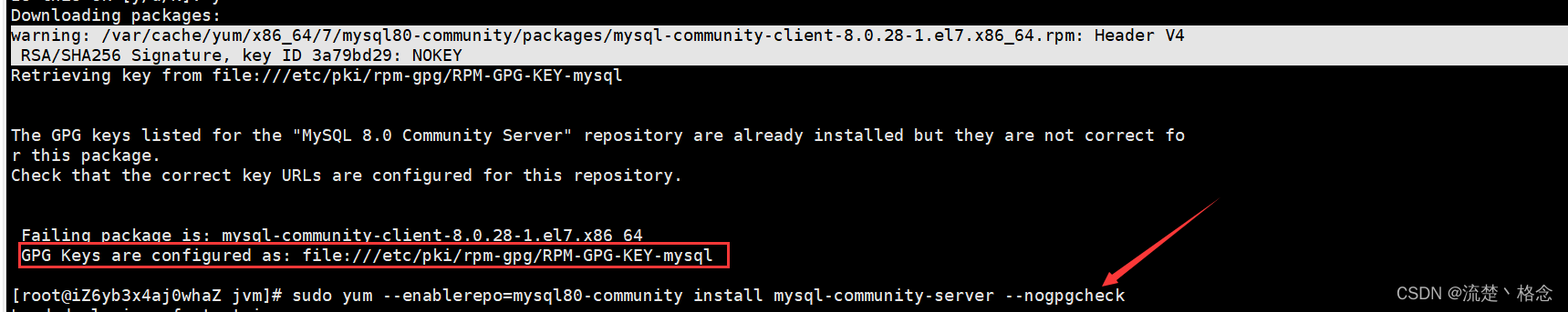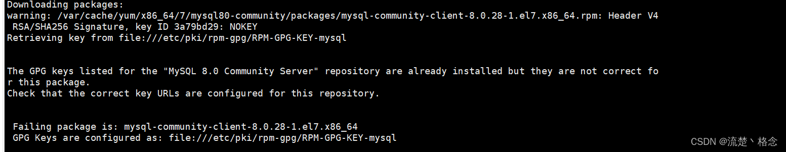 warning: /var/cache/yum/x86_64/7/mysql80-community/packages/mysql-community-client-8.0.28-1.el7.x86_64.rpm: Header V4 RSA/SHA256 Signature, key ID 3a79bd29: NOKEY Retrieving key from file:///etc/pki/rpm-gpg/RPM-GPG-KEY-mysql The GPG keys listed for the "MySQL 8.0 Community Server" repository are already installed but they are not correct for this package. Check that the correct key URLs are configured for this repository. Failing package is: mysql-community-client-8.0.28-1.el7.x86_64 GPG Keys are configured as: file:///etc/pki/rpm-gpg/RPM-GPG-KEY-mysql