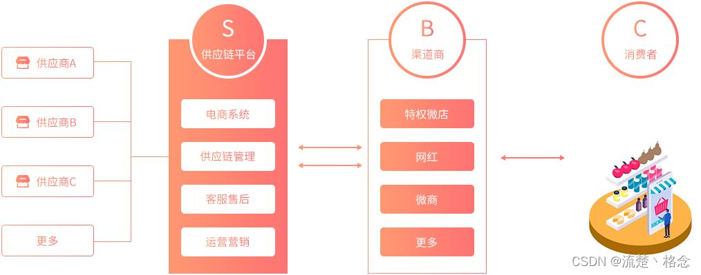 S2B2C是一种集合供货商赋能于渠道商并共同服务于顾客的全新电子商务营销模式。S2B2C中,S即是大供货商,B指渠道商,C为顾客。