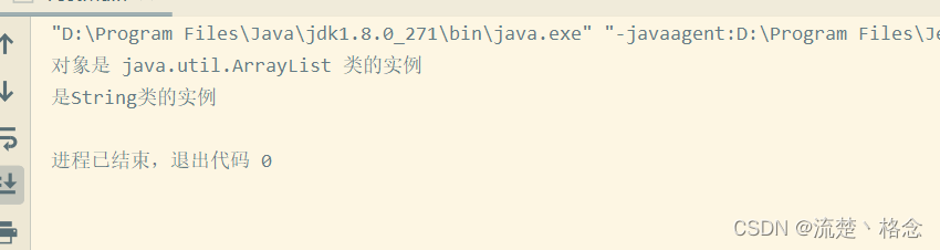 package cn.test; import java.util.ArrayList; import java.util.Vector; public class TestMain { public static void main(String[] args) { Object testObject = new ArrayList(); displayObjectClass(testObject); displayString("字"); } public static void displayObjectClass(Object o) { if (o instanceof Vector) System.out.println("对象是 java.util.Vector 类的实例"); else if (o instanceof ArrayList) System.out.println("对象是 java.util.ArrayList 类的实例"); else System.out.println("对象是 " + o.getClass() + " 类的实例"); } public static void displayString(String str){ if (str instanceof String) System.out.println("是String类的实例"); } }