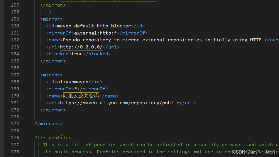 <mirror> <id>aliyunmaven</id> <mirrorOf>*</mirrorOf> <name>阿里云公共仓库</name> <url>https://maven.aliyun.com/repository/public</url> </mirror>