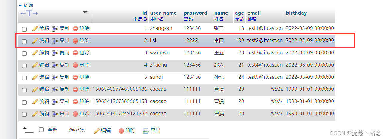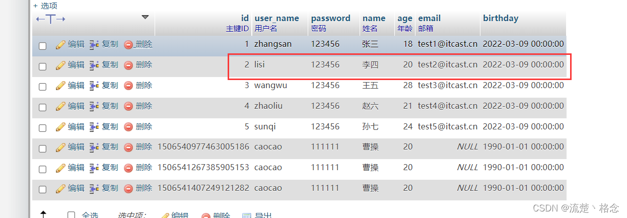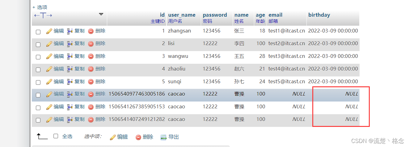 上边根据id更新 根据条件更新的方法只能将对象中不为NULL的属性更新到表中,下边通过UpdateWrapper进行更新,将birthday字段更新为NULL。