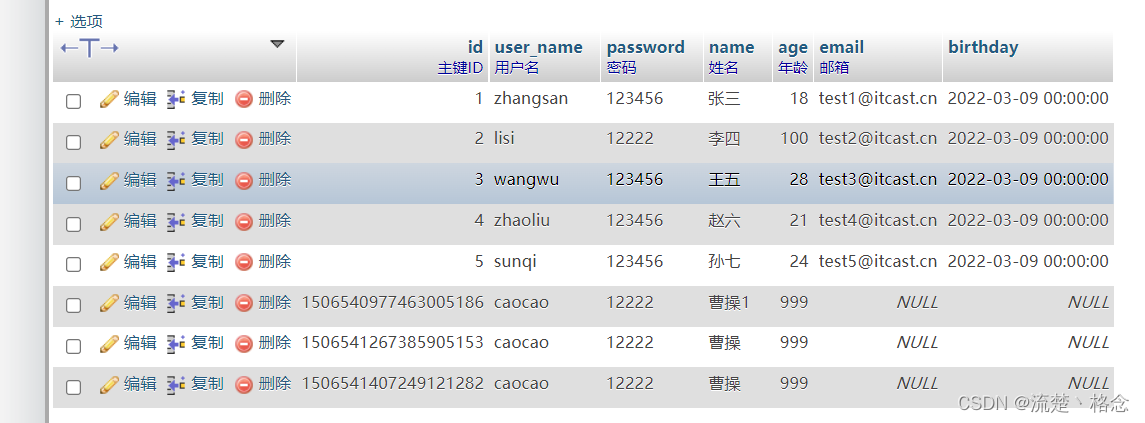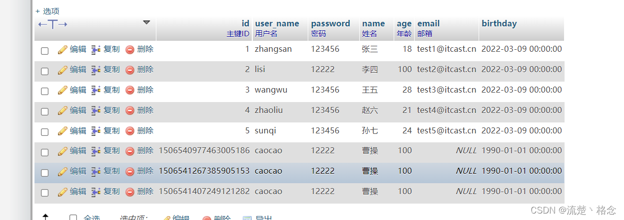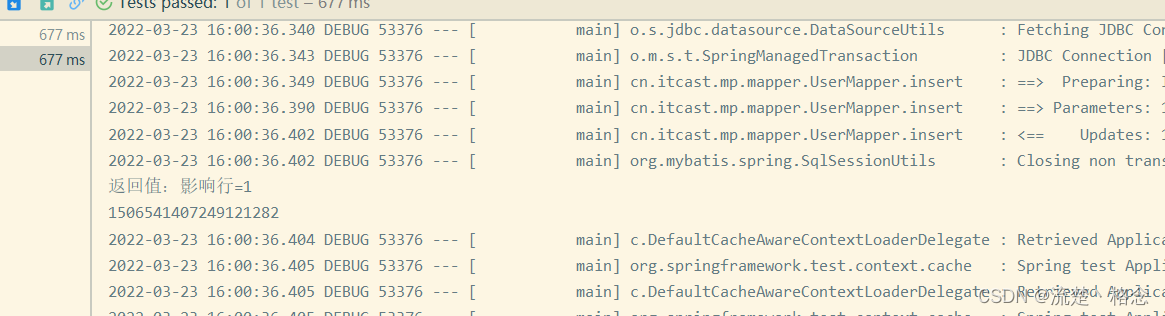 //插入 @Test public void testInsert(){ User user = new User(); // user.setId(100L); user.setName("曹操"); user.setPassword("111111"); user.setAge(20); user.setUserName("caocao"); DateTimeFormatter dateTimeFormatter = DateTimeFormatter.ofPattern("yyyy-MM-DD HH:mm:ss"); LocalDateTime localDateTime = LocalDateTime.parse("1990-01-01 00:00:00", dateTimeFormatter); user.setBirthday(localDateTime); int i = userMapper.insert(user); System.out.println(i); //自增后的id会回填到对象中 System.out.println(user.getId()); }