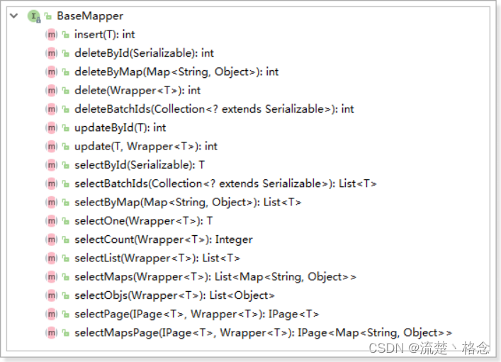通过前面的学习,我们了解到通过继承BaseMapper就可以获取到各种各样的单表操作,接下来我们将详细讲解这 些操作,下图是BaseMapper的各各方法:
