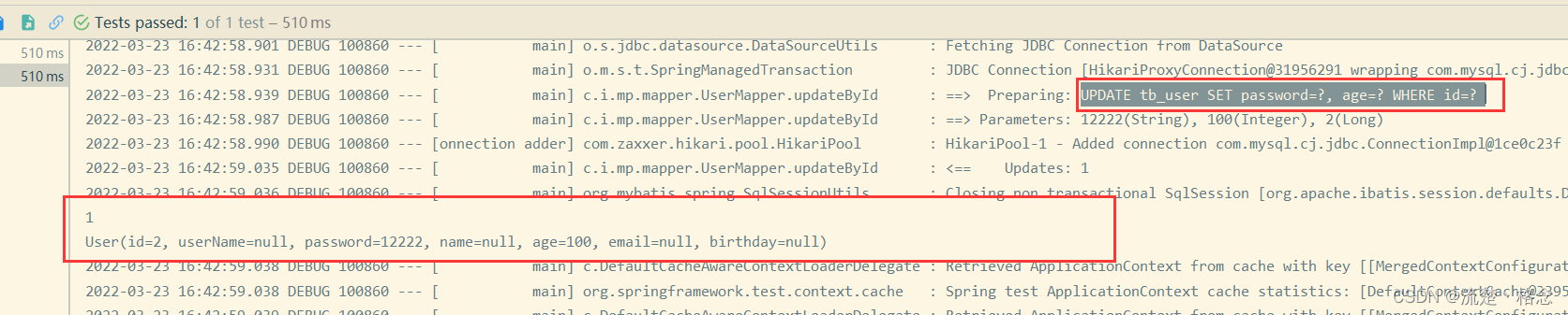 //根据条件进行更新 @Test public void testUpdate2(){ User user = new User(); user.setAge(100);//要更新的值 user.setPassword("12222");//要更新的值 //设置条件 QueryWrapper<User> queryWrapper =new QueryWrapper<>(); queryWrapper.eq("name","曹操"); //只将对象中不为NULL的值更新到数据库中 int i = userMapper.update(user,queryWrapper); System.out.println(i); }