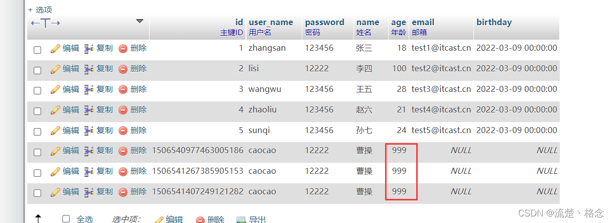 //根据条件进行更新,可以将为NULl的值更新到数据库 @Test public void testUpdate4(){ UpdateWrapper<User> updateWrapper = new UpdateWrapper<>(); updateWrapper.eq("name","曹操").set("age", 999).set("birthday",null); //只将对象中不为NULL的值更新到数据库中 int i = userMapper.update(null,updateWrapper); System.out.println(i); }