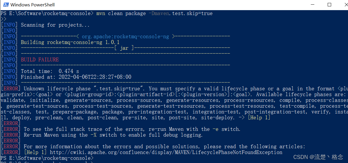 [ERROR] Unknown lifecycle phase ".test.skip=true". You must specify a valid lifecycle phase or a goal in the format <plugin-prefix>:<goal> or <plugin-group-id>:<plugin-artifact-id>[:<plugin-version>]:<goal>. Available lifecycle phases are: validate, initialize, generate-sources, process-sources, generate-resources, process-resources, compile, process-classes, generate-test-sources, process-test-sources, generate-test-resources, process-test-resources, test-compile, process-test-classes, test, prepare-package, package, pre-integration-test, integration-test, post-integration-test, verify, install, deploy, pre-clean, clean, post-clean, pre-site, site, post-site, site-deploy. -> [Help 1] [ERROR] [ERROR] To see the full stack trace of the errors, re-run Maven with the -e switch. [ERROR] Re-run Maven using the -X switch to enable full debug logging. [ERROR] [ERROR] For more information about the errors and possible solutions, please read the following articles: [ERROR] [Help 1] http://cwiki.apache.org/confluence/display/MAVEN/LifecyclePhaseNotFoundException