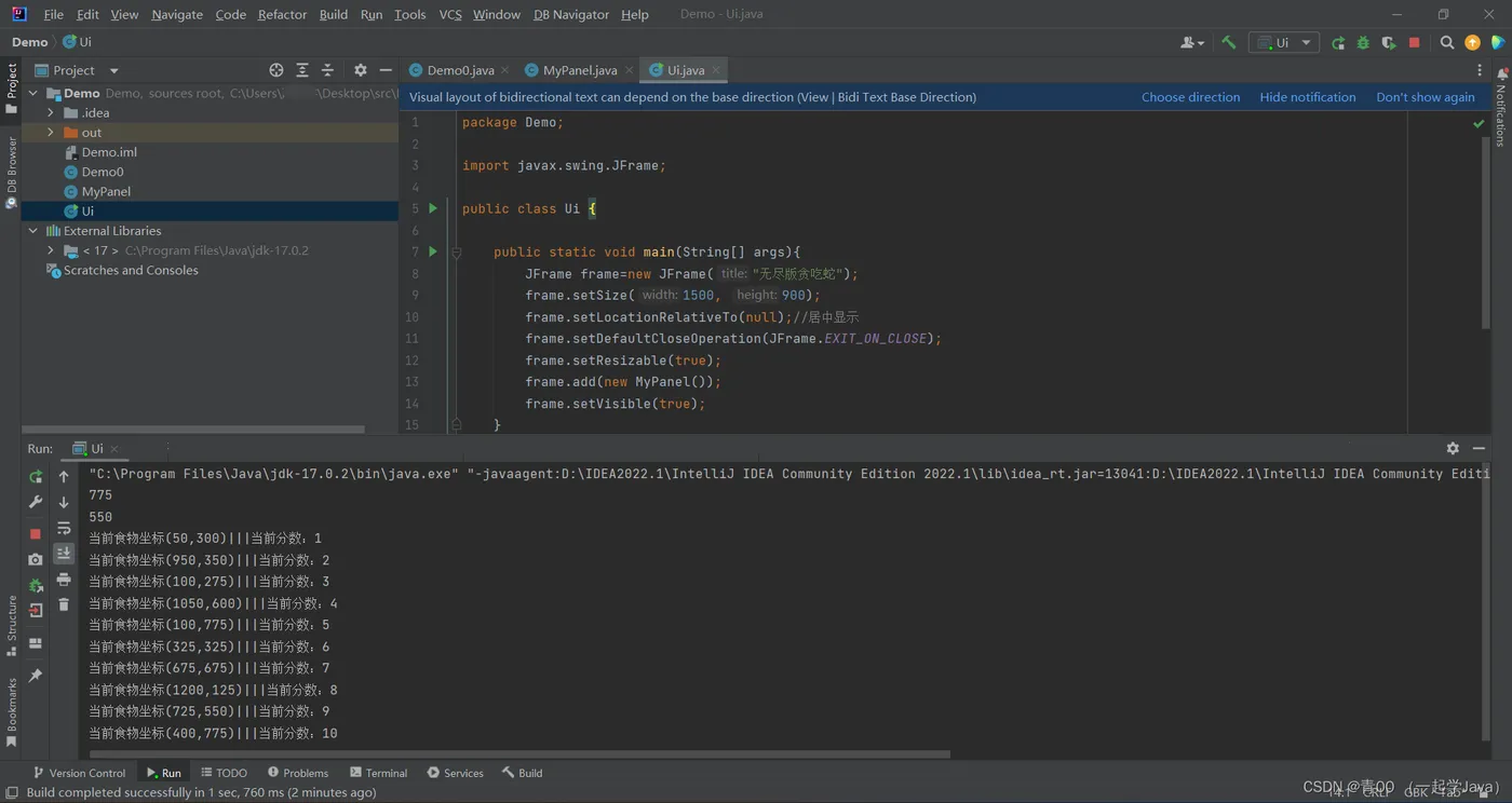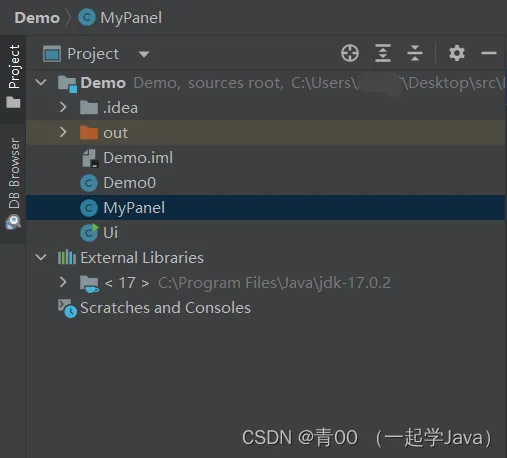 本程序用于初学者学习,共封装三个类,分别是Demo类,MyPanel类,框架Ui类,结构简单,所有方法均在MyPanel类中实现。