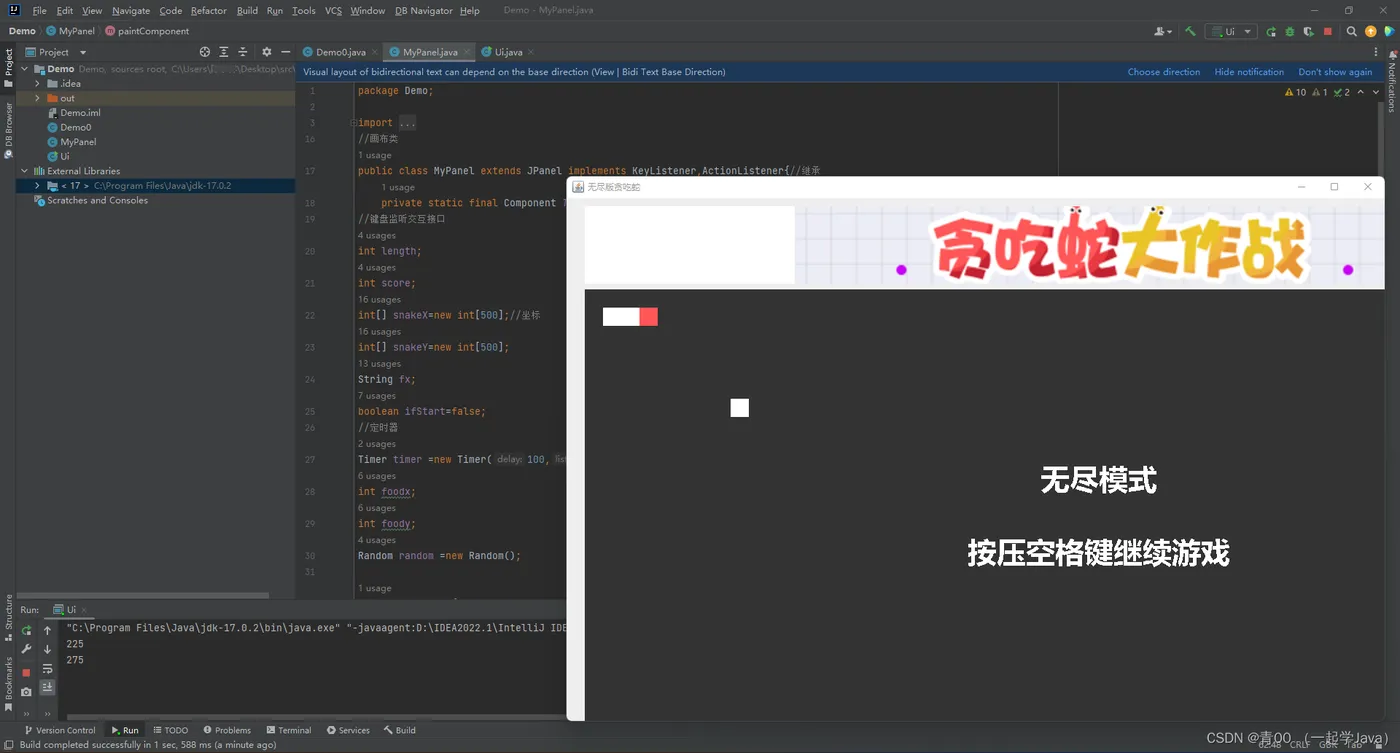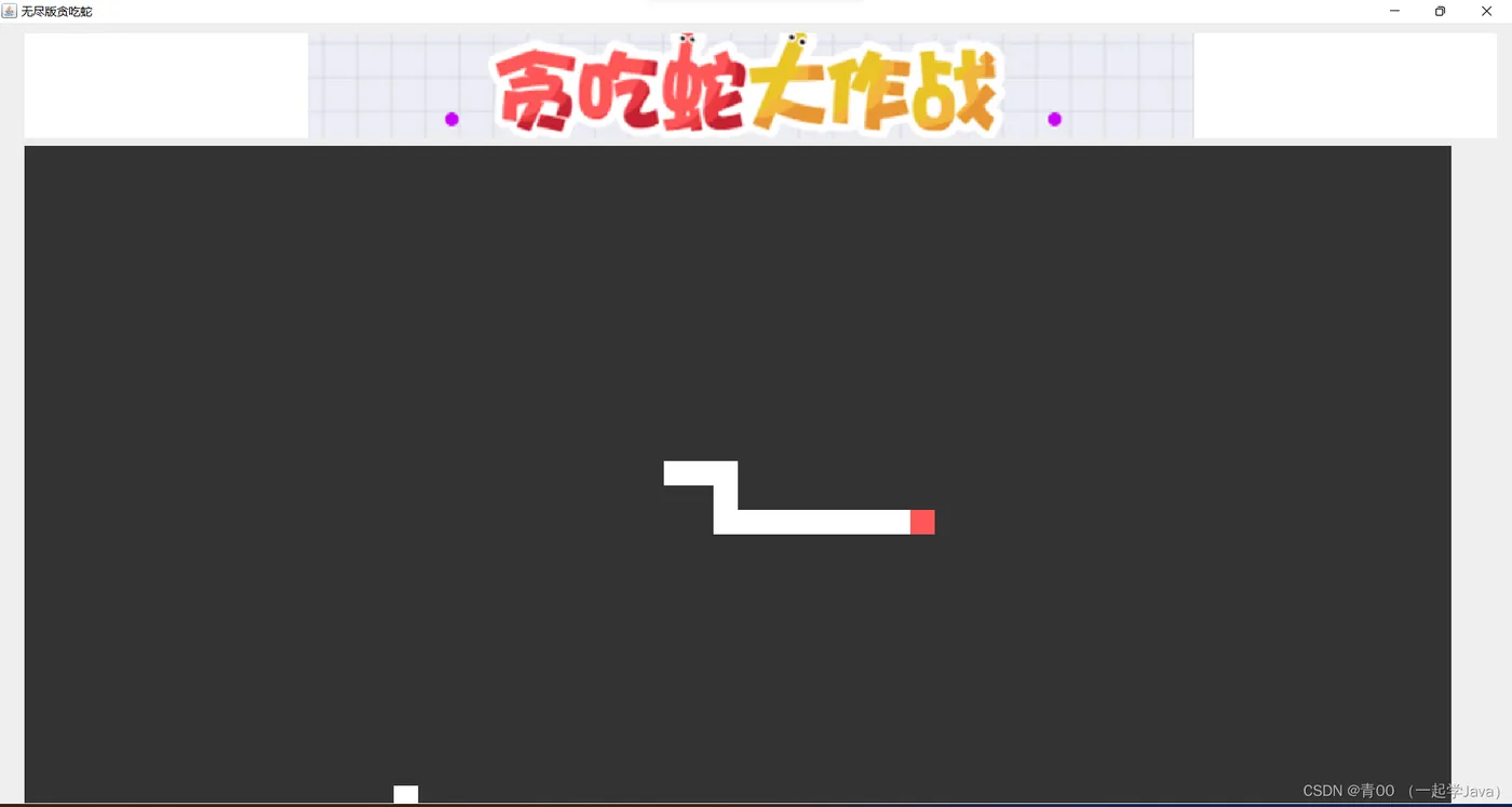 @Override protected void paintComponent(Graphics g){//画笔对象 super.paintComponent(g); //绘制顶部的标题 new ImageIcon("C:/Users/Desktop/img/title2.png").paintIcon(this,g,25,11);//创建对象 //绘制游戏区域 g.fillRect(25, 125, 1450, 700); //绘制小蛇 //蛇头 new ImageIcon("C:/Users/Desktop/img/l.png").paintIcon(this, g, snakeX[0], snakeY[0]); //蛇身 for(int i=1;i<length;i++){ new ImageIcon("C:/Users/Desktop/img/body.png").paintIcon(This, g, snakeX[i], snakeY[i]); } //游戏的提示语 if(ifStart==false){ g.setColor(Color.white); g.setFont(new Font("微软雅黑",Font.BOLD,40)); g.drawString("按压空格键继续游戏", 550,500); g.drawString("无尽模式", 650,400); } //画出食物的位置 new ImageIcon("C:/Users/Desktop/img/body.png").paintIcon(this, g, foodx, foody); } @Override//按压 public void keyPressed(KeyEvent e) { int keyCode=e.getKeyCode(); if(keyCode==KeyEvent.VK_SPACE){ ifStart=!ifStart; } if(ifStart==true){ if(keyCode==KeyEvent.VK_LEFT&&fx!="r"){ fx="l"; }else if(keyCode==KeyEvent.VK_RIGHT&&fx!="l"){ fx="r"; }else if(keyCode==KeyEvent.VK_UP&&fx!="d"){ fx="u"; }else if(keyCode==KeyEvent.VK_DOWN&&fx!="u"){ fx="d"; } } repaint(); }
