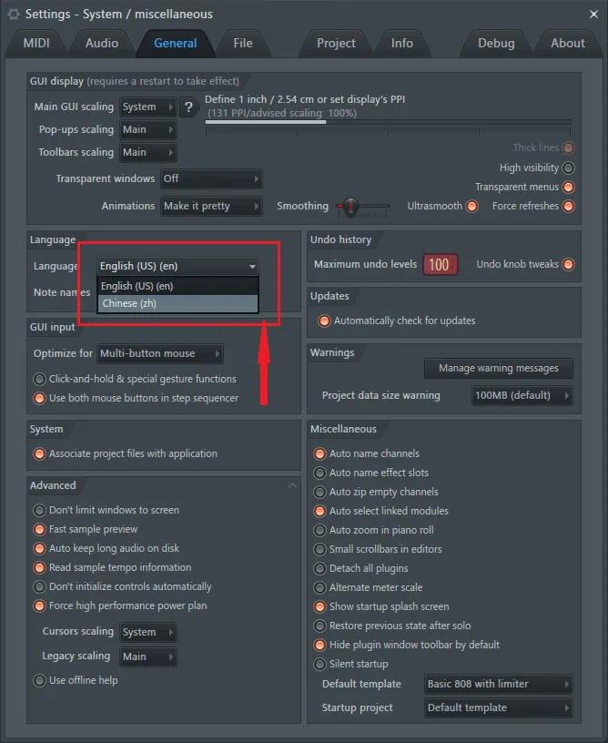 (2)这里是调整FL Studio的常规设置的面板,在图中红框框出来的那里选择“Chinese(zh)”