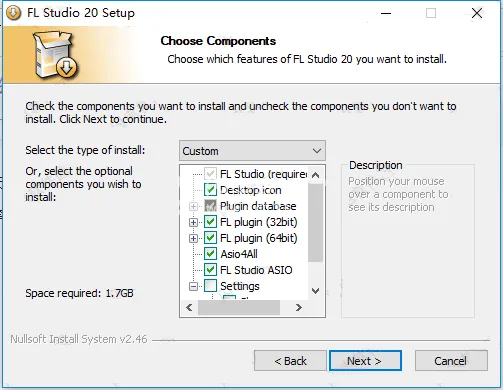 6、选择软件安装类型和功能,小编系统是64位的,所以把flstudio32位勾选掉,点击next