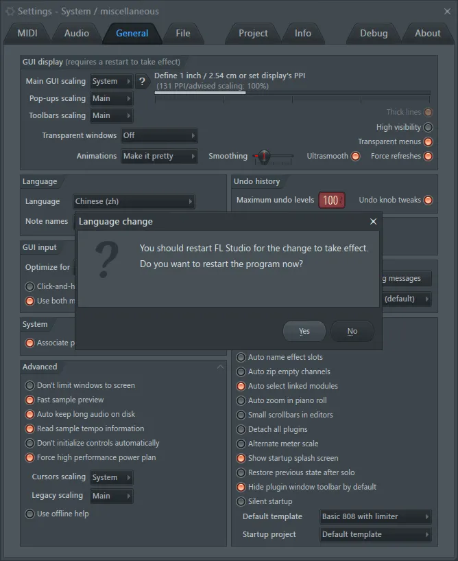 (3)随后FL Studio会弹出一个提示,大致意思是FL Studio需要重启以应用刚才的修改,这里我们直接点击“Yes”即可。