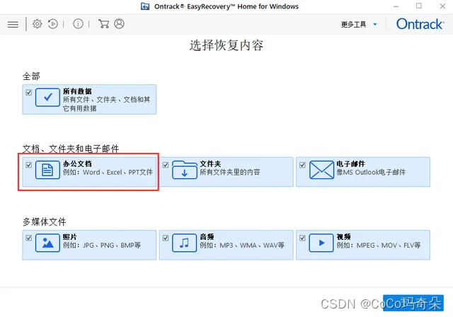 打开EasyRecovery软件,选择误删除待恢复文件的文件类型,如果不知道什么类型,选择所有数据就对了。