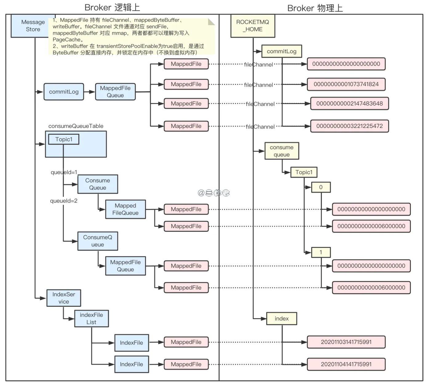 关键点在如何获取可以写入的 CommitLog。存储结构小节里面有提到每个 CommitLog 默认大小 1G,写完一个文件,以偏移量命名创建下一个文件。每个 1G 大小 CommitLog 的在代码层面对应的是 MappedFile,而多个 MappedFiled 组成 MappedFileQueue。逻辑上的 CommitLog 通过持有 MappedFileQueue 管理多个 MappedFile。所以,获取可以写入的 CommitLog 也就是获取 MappedFileQueue 最后一个 MappedFile,为什么是最后一个,因为前面的已经写完了呀。来看看 RocketMQ 逻辑与物理存储的对应关系应该能够更直观的理解。 - 获取到最后一个 MappedFile 后,调用 MappedFile.appendMessage 将消息追加到该文件中。可是尽管是顺序写入,但是连小学生都知道写磁盘还是很慢,难道想这样支撑 RocketMQ 单机十万吞吐量?too young too simple!从逻辑存储结构和物理存储结构的映射关系来看,MappedFile 持有物理 CommitLog 的 fileChannel (Java NIO 文件读写的通道),通过 fileChannel 可以访问物理 CommitLog 文件,但是 RocketMQ 并没有直接使用 fileChannel,而是映射到一个 MappedByteBuffer,我们的目的就是把消息写入这个 ByteBuffer 中,进而写入 MappedFile 对应的 CommitLog 文件。为什么需要这样做,还有哪些细节,会在”文件内存映射“小结中为大家解答。