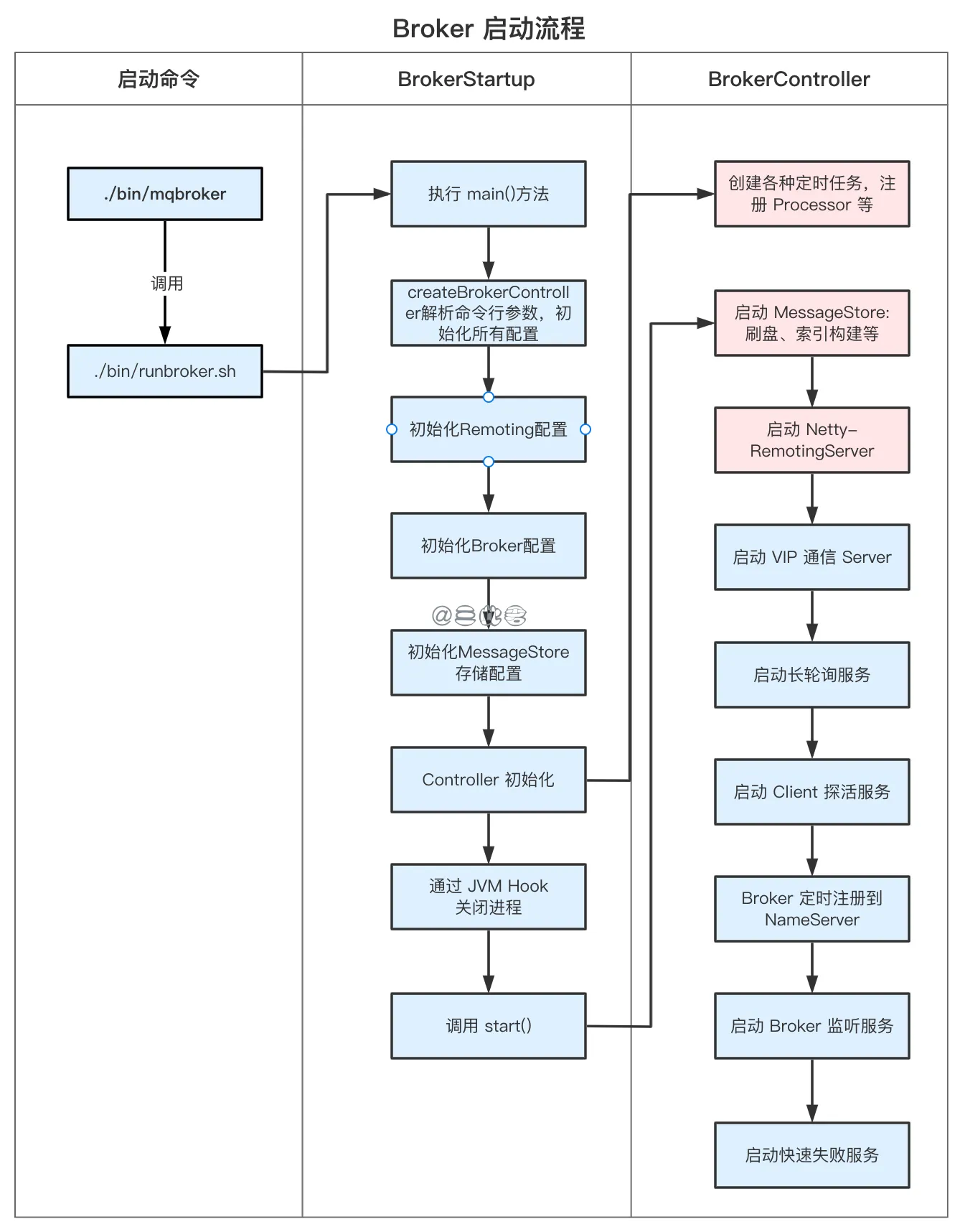- 启动 RocketMQ 的各个组件。但是这些组件并不是每一个都是核心组件,部分组件会在后面的流程中使用,这里混个眼熟,如果后面流程没有提及的大家可以暂且跳过,我们的目标是把握 RocketMQ 的核心内容,而不是每个细节。