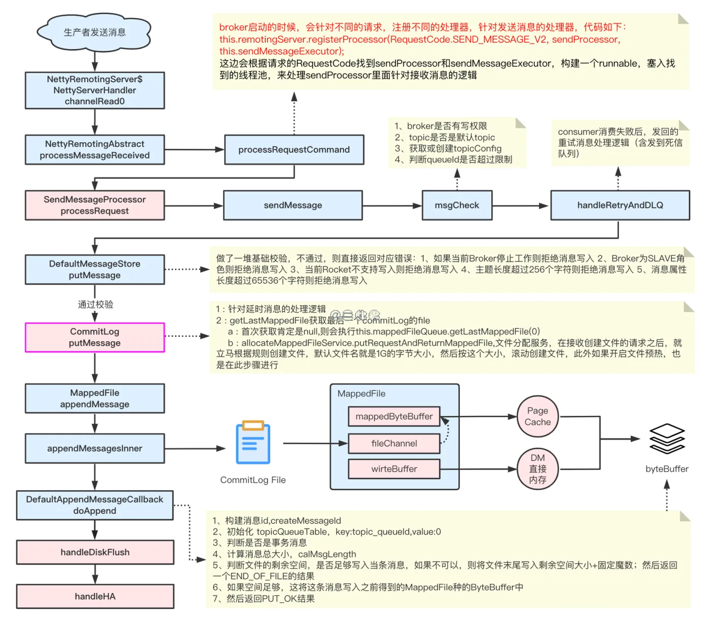 - Broker 收到消息存储请求,经过层层校验,获取 CommitLog 对应的 MappedFile,将消息写入MappedFile 对应的内存映射ByteBuffer;