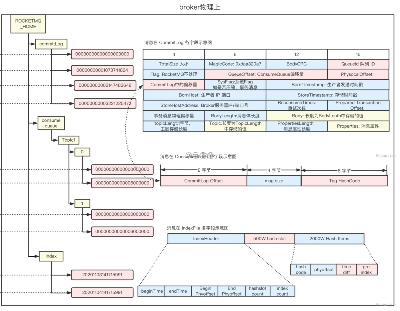 - 要理解消息的存储流程需要先知道消息的存储结构:在物理上消息挨个顺序写入 CommitLog,为了提升消息查询效率需要构建消息的索引文件 ConsumeQueue/IndexFile;