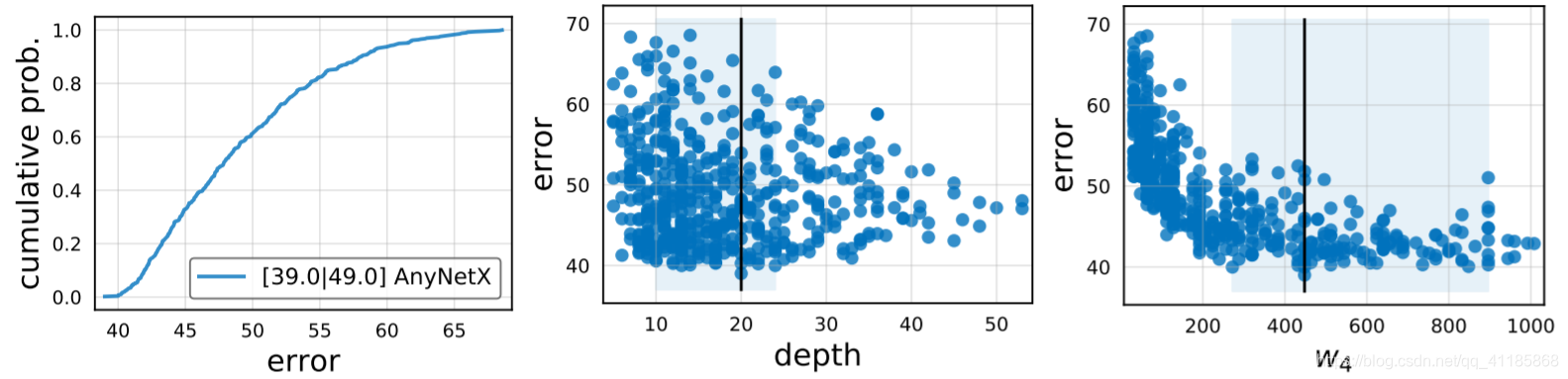Figure 2. Statistics of the AnyNetX design space computed with n = 500 sampled models. Left: The error empirical distribution function (EDF) serves as our foundational tool for visualizing the quality of the design space. In the legend we report the min error and mean error (which corresponds to the area under the curve). Middle: Distribution of network depth d (number of blocks) versus error. Right: Distribution of block widths in the fourth stage (w4) versus error. The blue shaded regions are ranges containing the best models with 95% confidence (obtained using an empirical bootstrap), and the black vertical line the most likely best value. |