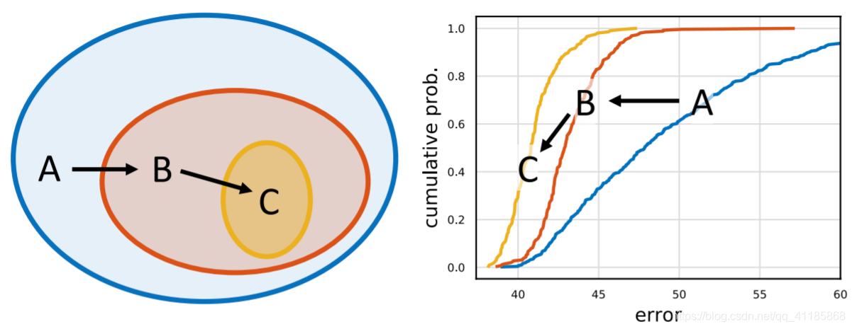 Figure 1. Design space design. We propose to design network design spaces, where a design space is a parametrized set of possible model architectures. Design space design is akin to manual network design, but elevated to the population level. In each step of our process the input is an initial design space and the output is a refined design space of simpler or better models. Following [21], we characterize the quality of a design space by sampling models and inspecting their error distribution. For example, in the figure above we start with an initial design space A and apply two refinement steps to yield design spaces B then C. In this case C ⊆ B ⊆A (left), and the error distributions are strictly improving from A to B to C (right). The hope is that design principles that apply to model populations are more likely to be robust and generalize. While manual network design has led to large advances, finding well-optimized networks manually can be challenging, especially as the number of design choices increases. A popular approach to address this limitation is neural architecture search (NAS). Given a fixed search space of possible networks, NAS automatically finds a good model within the search space. Recently, NAS has received a lot of attention and shown excellent results [34, 18, 29]. Despite the effectiveness of NAS, the paradigm has limitations. The outcome of the search is a single network instance tuned to a specific setting (e.g., hardware platform). This is sufficient in some cases; however, it does not enable discovery of network design principles that deepen our understanding and allow us to generalize to new settings. In particular, our aim is to find simple models that are easy to understand, build upon, and generalize. |