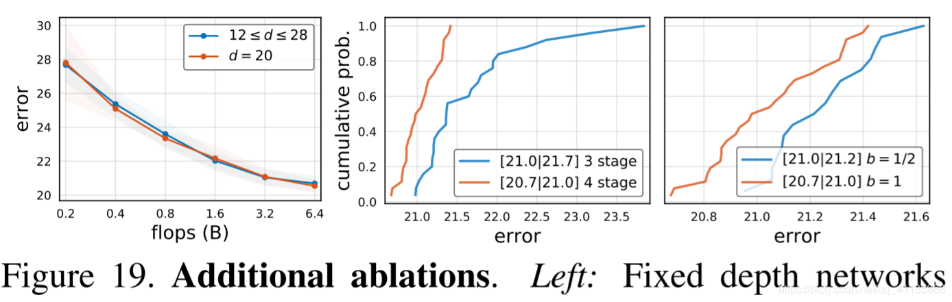 图19所示。额外的消融。左:固定深度网络(d = 20)在越空越有效。中间:三个阶段的网络在高失败时表现很差。右:反向瓶颈(b < 1)在高次失败时也是无效的。参见文本了解更多上下文。