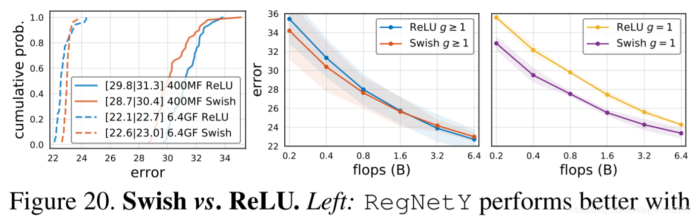 图20。漂亮与ReLU。左图:RegNetY在400MF时的Swish表现比ReLU好,但在6.4GF时表现更差。中:更广泛的翻牌方法的结果显示了类似的趋势。正确:然而,如果g被限制为1(深度conv), Swish更好。 |