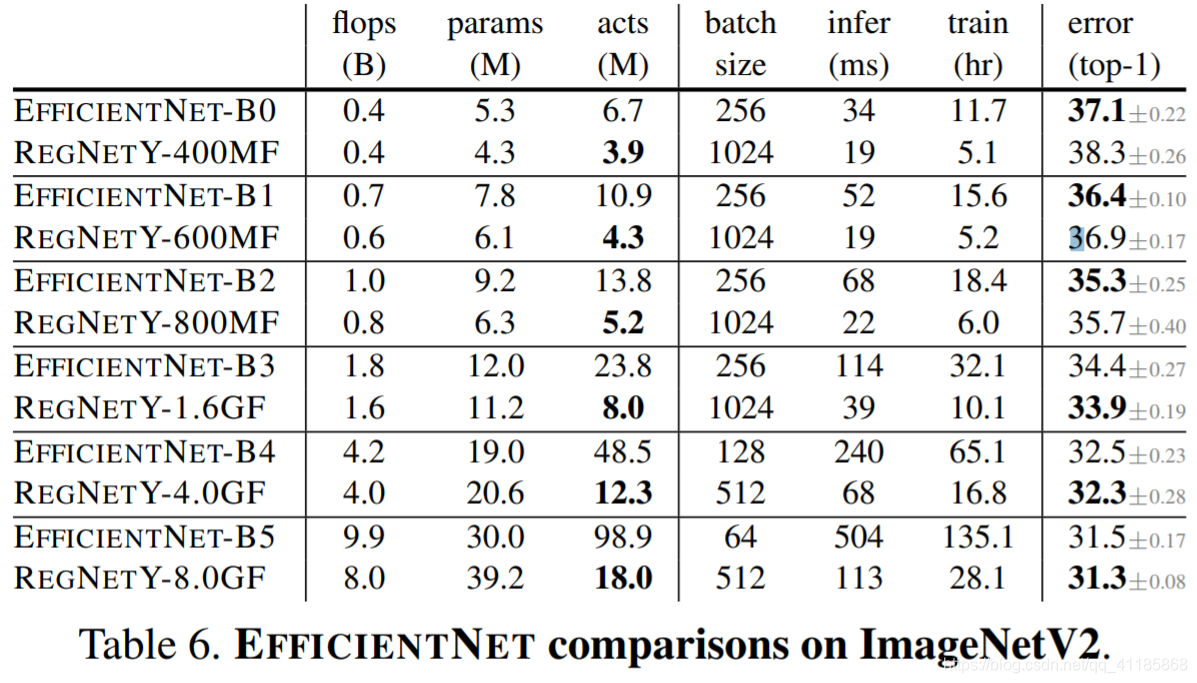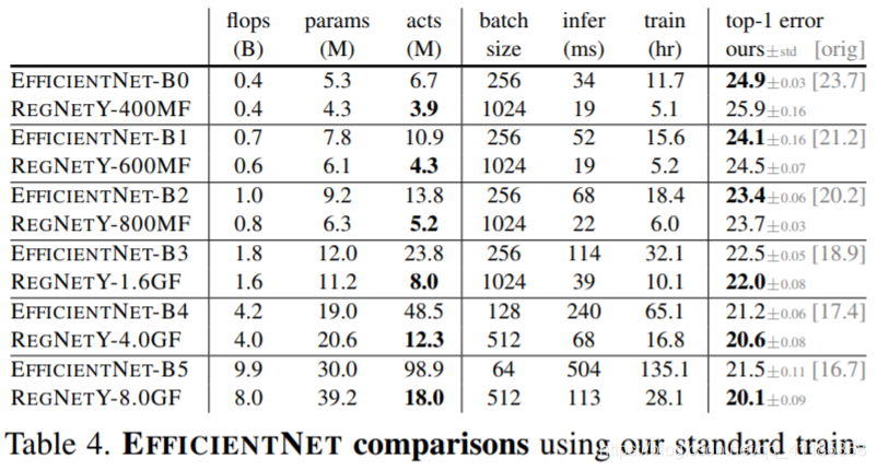 表4。使用我们的标准训练时间表进行有效的比较。在可比的训练环境下,REGNETY在大多数翻背战术中都表现得比有效网更好。此外,REGNET模型要快得多,例如,REGNET - f8000大约比efficient entnet - b5快5倍。请注意,efficient entnet最初报告的错误(显示为灰色)要低得多,但是使用更长的和增强的训练计划,见表7。