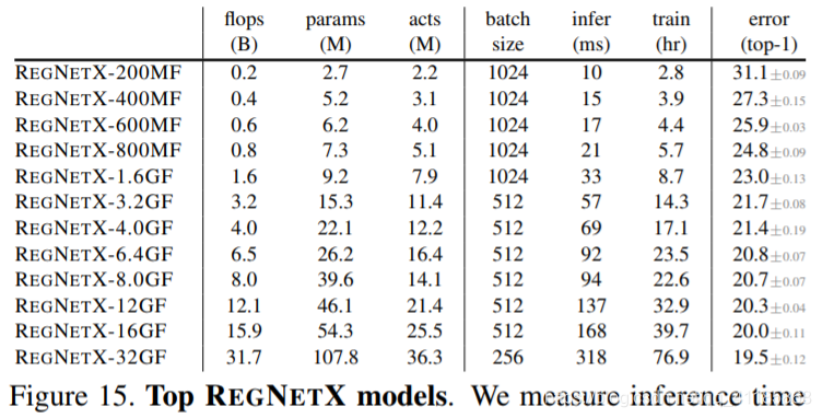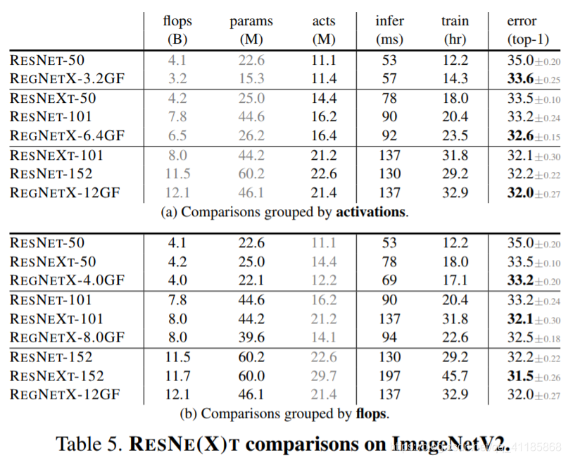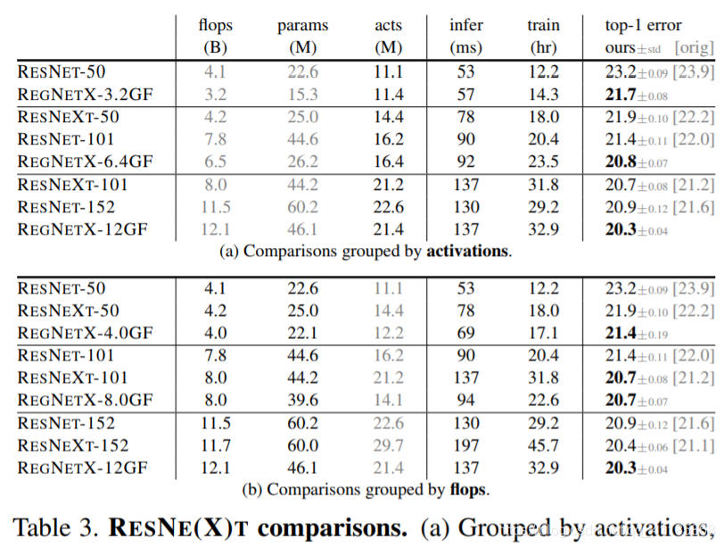 表3。RESNE T (X)的比较。(a)按照激活分组,REGNETX显示了相当大的增益(注意,对于每个组,GPU推断和训练时间是相似的)。(b) REGNETX模型的表现也优于RESNE(X)T模型。