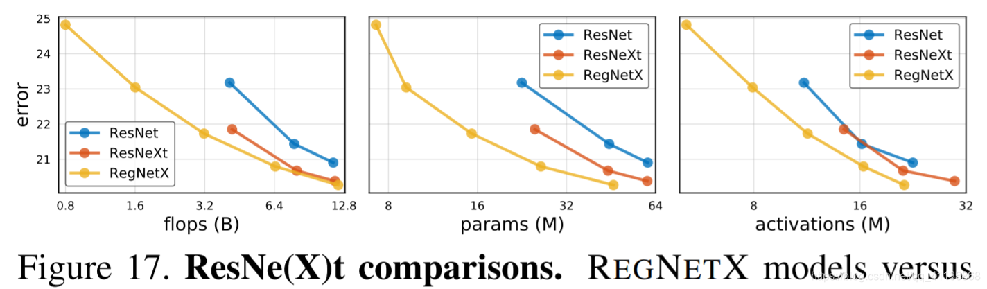 图17。ResNe t (X)的比较。在各种复杂度指标下,REGNETX模型与RESNE(X)T-(50,101,152)模型的比较。由于所有的模型都使用相同的组件和训练设置,所有观察到的收益都来自RegNetX设计空间的设计