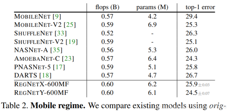表2。移动的政权。我们将使用原始报告错误的现有模型与在基本设置中训练的RegNet模型进行比较。我们简单的RegNet模型取得了令人惊讶的好结果,因为在过去几年中我们一直致力于此机制。
