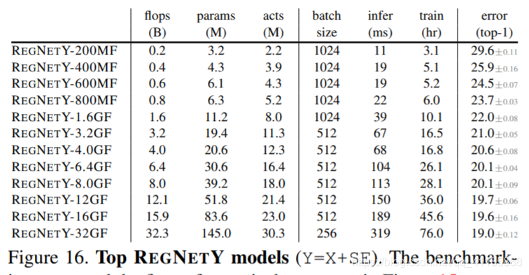 图15。顶级REGNETX模型。我们在NVIDIA V100 GPU上测量64幅图像的推理时间;在8个gpu上的训练时间为100个epoch,列出了批量大小。网络图图例包含实现模型所需的所有信息。 图16。顶级权威模型(Y=X+SE)。基准测试的设置和图的格式与图15相同。 |