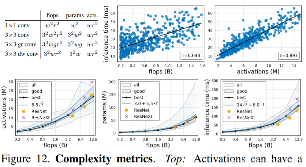 图12。复杂性度量。Top:与flops相比,激活在硬件加速器上与运行时的相关性更强(我们在NVIDIA V100 GPU上测量64张图像的推断时间)。底部:趋势分析的复杂性与失败和最佳拟合曲线(蓝色显示)的趋势的最佳模型(黑色曲线)。