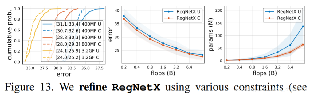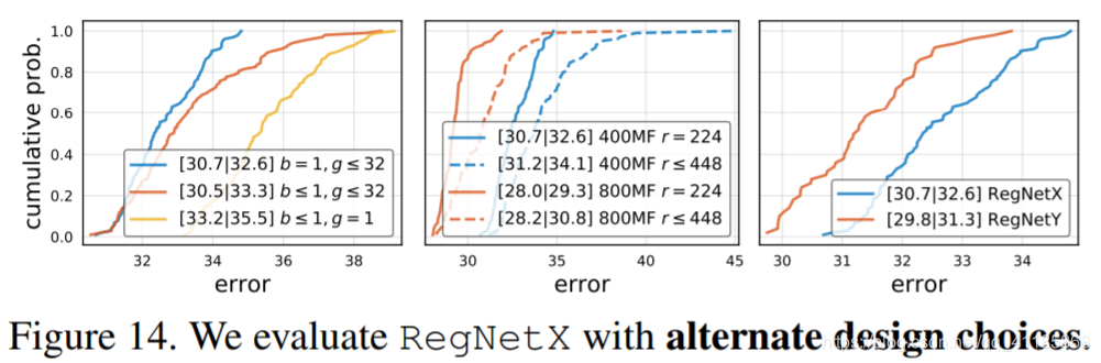 图13。我们使用各种约束来细化RegNetX(参见文本)。约束变式(C)在所有的触发器中都是最好的,同时在参数和激活方面更有效。 图14。我们评估RegNetX的备选设计选择。左:倒瓶颈(1 8≤b≤1)降低结果,深度conv (g = 1)更差。中间:变化的分辨率对结果有害。右:RegNetY (Y=X+SE)改善EDF。 |