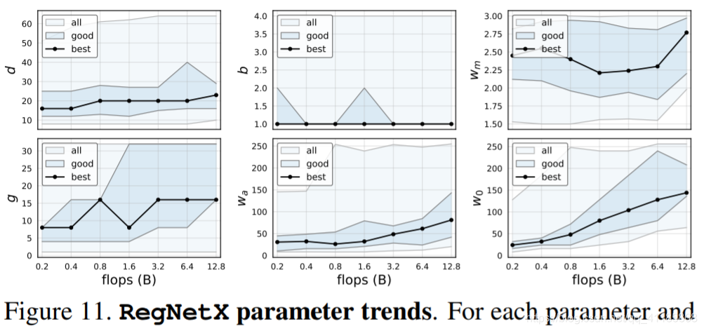 图11。RegNetX参数趋势。对于每个参数和每个触发器,我们应用经验自举法获得包含95%置信度的最佳模型(用蓝色底纹表示)和可能的最佳模型(黑线表示)的范围,参见图2。我们观察到,对于最佳模型,深度d在flops范围内非常稳定,b = 1和wm≈2.5是最佳的。块和组的宽度(wa、w0、g)随着拖放而增加。