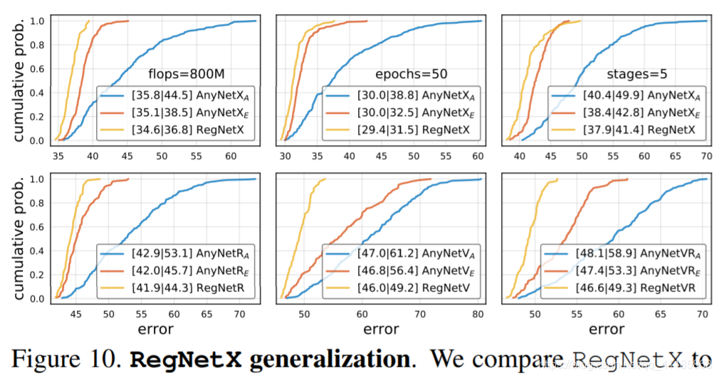 我们在只有一个块类型的低计算、低历元训练机制中设计了RegNet设计空间。然而,我们的目标不是为单一的设置设计一个设计空间,而是发现可以推广到新设置的网络设计的一般原则。 在图10中,我们将RegNetX设计空间与AnyNetXA和AnyNetXE在更高的flops、更高的epoch、5级网络和各种块类型(在附录中进行了描述)下进行了比较。在所有情况下,设计空间的顺序是一致的,使用RegNetX > AnyNetXE > AnyNetXA。换句话说,我们没有看到过度拟合的迹象。这些结果很有希望,因为它们表明RegNet可以泛化到新的设置。5阶段的结果表明,正则RegNet结构可以推广到更多的阶段,其中AnyNetXA具有更多的自由度。 |
