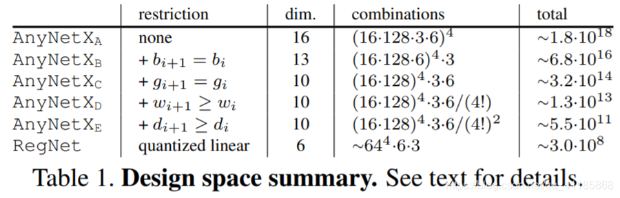 AnyNetX的sic统计数据如图2所示。在AnyNetX设计空间中有(16·128·3·6)4≈1018种可能的模型配置。我们不是从这些∼1018配置中寻找单个的最佳模型,而是探究是否有通用的设计原则可以帮助我们理解和改进这个设计空间。为此,我们采用了设计设计空间的方法。在这方法的每一步,我们的目标是: