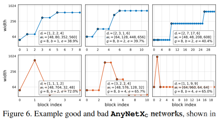 图6。示例好的和坏的AnyNetXC网络,分别显示在顶部和底部行。对于每个网络,我们绘制每个块j的宽度wj,直到网络深度d。这些每个块宽度wj是由每个阶段的块深度di和块宽度wi计算出来的(列在图例中以供参考)。