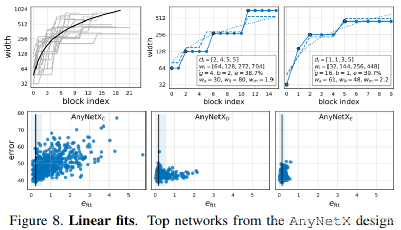 Figure 5. AnyNetXB (left) and AnyNetXC (middle) introduce a shared bottleneck ratio bi = b and shared group width gi = g, respectively. This simplifies the design spaces while resulting in virtually no change in the error EDFs. Moreover, AnyNetXB and AnyNetXC are more amendable to analysis. Applying an empirical bootstrap to b and g we see trends emerge, e.g., with 95% confidence b ≤ 2 is best in this regime (right). No such trends are evident in the individual bi and gi in AnyNetXA (not shown). Figure 6. Example good and bad AnyNetXC networks, shown in the top and bottom rows, respectively. For each network, we plot the width wj of every block j up to the network depth d. These per-block widths wj are computed from the per-stage block depths di and block widths wi (listed in the legends for reference). Figure 7. AnyNetXD (left) and AnyNetXE (right). We show various constraints on the per stage widths wi and depths di. In both cases, having increasing wi and di is beneficial, while using constant or decreasing values is much worse. Note that AnyNetXD = AnyNetXC + wi+1 ≥ wi, and AnyNetXE = AnyNetXD + di+1 ≥ di. We explore stronger constraints on wi and di shortly. Figure 8. Linear fits. Top networks from the AnyNetX design space can be well modeled by a quantized linear parameterization, and conversely, networks for which this parameterization has a higher fitting error efit tend to perform poorly. See text for details. |
