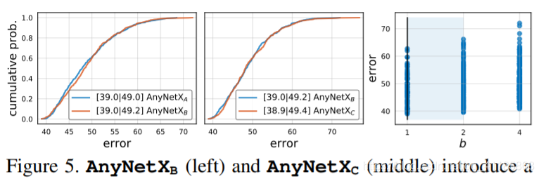 图5。AnyNetXB(左)和AnyNetXC(中)分别引入了共享瓶颈比bi = b和共享组宽度gi = g。这简化了设计空间,同时几乎不会改变错误EDFs。此外,AnyNetXB和AnyNetXC更易于进行分析。对b和g应用经验自举法,我们可以看到趋势的出现,例如,在这种情况下,95%置信b≤2是最好的(右)。在AnyNetXA的个体bi和gi中没有明显的这种趋势(未显示)。