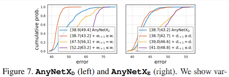 图7。AnyNetXD(左)和AnyNetXE(右)。我们给出了每个阶段宽度wi和深度di的各种约束条件。在这两种情况下,增加wi和di是有益的,而使用常数或递减值则更糟。注意AnyNetXD = AnyNetXC + wi+1≥wi,且AnyNetXE = AnyNetXD + di+1≥di。我们将很快探讨对wi和di的更强约束。 |