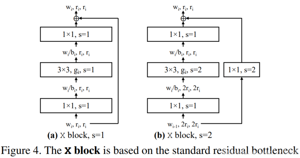 Figure 4. The X block is based on the standard residual bottleneck block with group convolution [31]. (a) Each X block consists of a 1×1 conv, a 3×3 group conv, and a final 1×1 conv, where the 1×1 convs alter the channel width. BatchNorm [12] and ReLU follow each conv. The block has 3 parameters: the width wi, bottleneck ratio bi, and group width gi. (b) The stride-two (s = 2) version. |