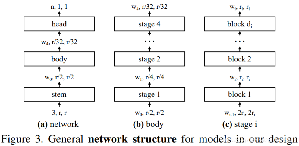 Figure 3. General network structure for models in our design spaces. (a) Each network consists of a stem (stride-two 3×3 conv with w0 = 32 output channels), followed by the network body that performs the bulk of the computation, and then a head (average pooling followed by a fully connected layer) that predicts n output classes. (b) The network body is composed of a sequence of stages that operate at progressively reduced resolution ri. (c) Each stage consists of a sequence of identical blocks, except the first block which uses stride-two conv. While the general structure is simple, the total number of possible network configurations is vast. |