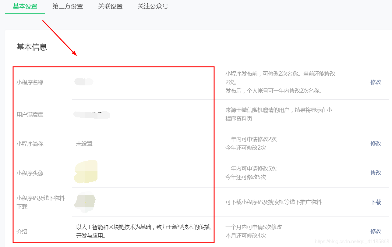 填写小程序基本信息,包括名称、头像、介绍及服务范围等。