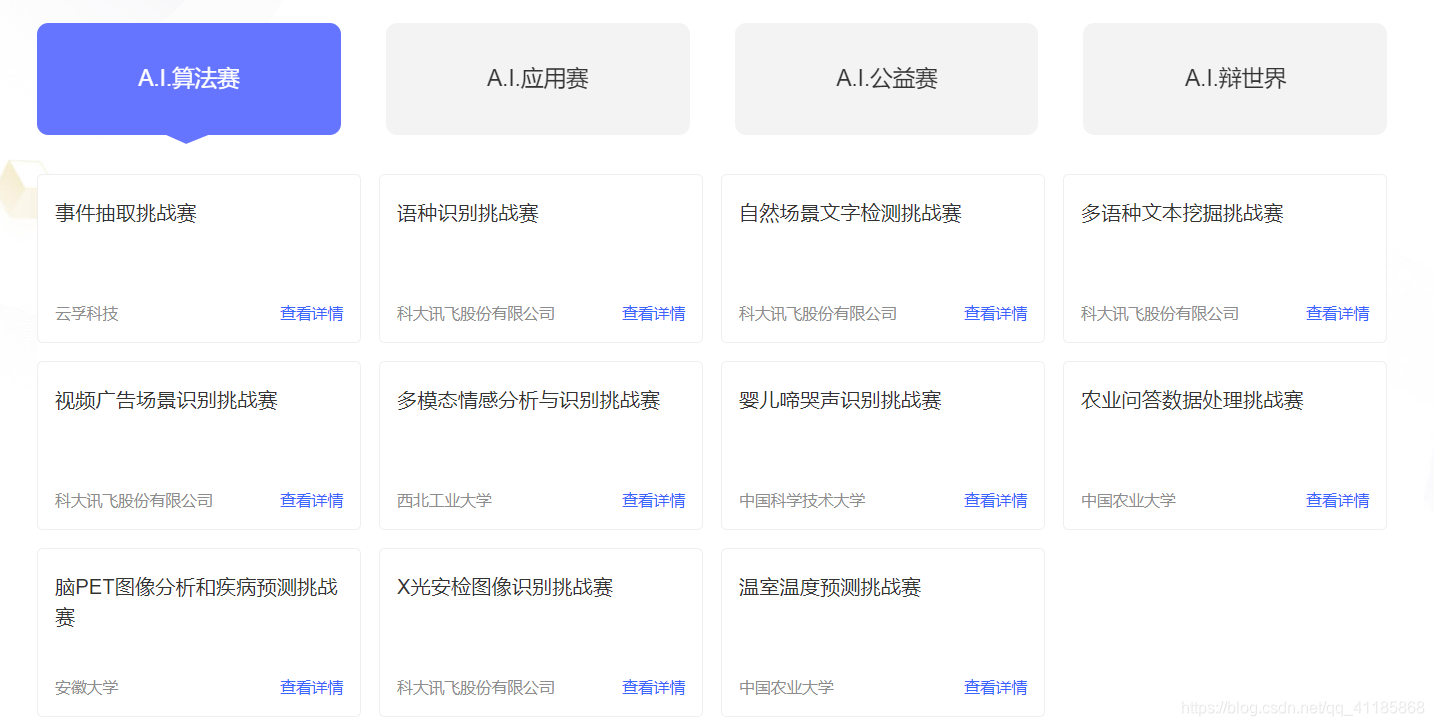 视频广告场景识别挑战赛、语种识别挑战赛、X光安检图像识别挑战赛、自然场景文字检测挑战赛、多语种文本挖掘挑战赛、脑PET图像分析和疾病预测挑战赛、婴儿啼哭声识别挑战赛、温室温度预测挑战赛、农业问答数据处理挑战赛、多模态情感分析与识别挑战赛、事件抽取挑战赛。