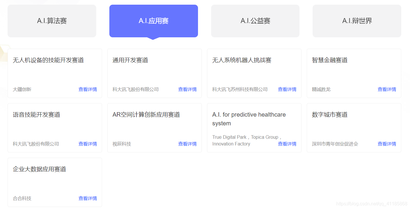 数字城市赛道、无人系统机器人挑战赛、语音技能开发赛道、海外赛道A.I. for Predictive Healthcare System、AR空间计算创新应用赛道、无人机设备的技能开发赛道、企业大数据应用赛道、通用开发赛道、智慧金融赛道