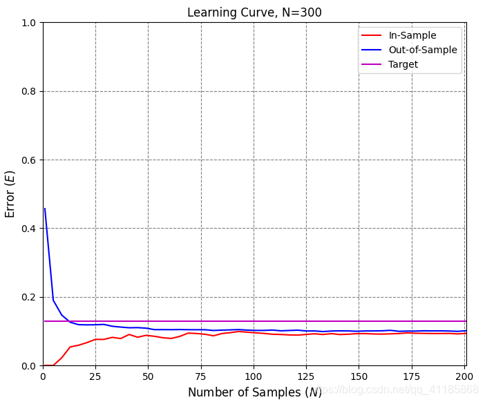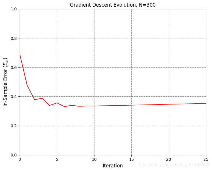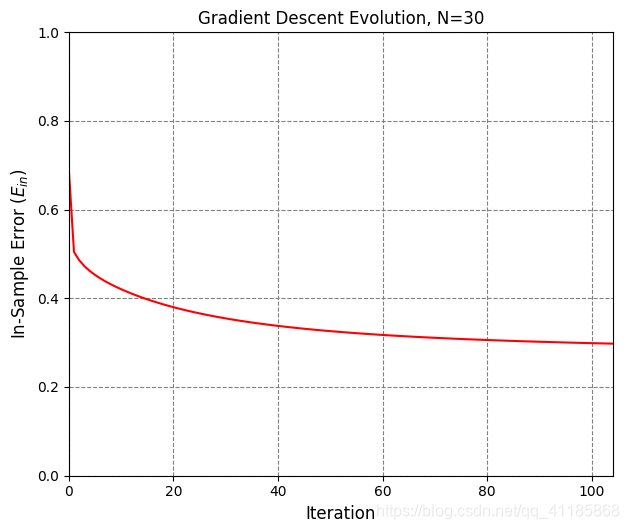 1. def in_sample_error(z, y, logisticGD_function): 2. y_h = (logisticGD_function(z) >= 0.5)*2-1 3. return np.sum(y != y_h) / float(len(y)) 4. 5. 6. def estimate_out_of_sample_error(Product_x_function, NOrderPoly_Function,Pre_Logistic_function, logisticGD_function, N=10000, Linear_function_h=None): 7. x = np.array([Product_x_function() for i in range(N)]) 8. z = np.apply_along_axis(NOrderPoly_Function, 1, x) 9. if not Linear_function_h is None: 10. z_h = np.apply_along_axis(Linear_function_h, 1, x) 11. else: 12. z_h = z 13. y = Pre_Logistic_function(z) 14. y_h = (logisticGD_function(z_h) >= 0.5)*2-1 15. return np.sum(y != y_h) / float(N) 16. 17. 18. def ErrorCurve_Plot(N,GD_w_hs, cross_entropy_error): 19. start_time = time.time() 20. fig = plt.figure() # figsize=(8, 6) 21. ax = fig.add_subplot(1, 1, 1) 22. ax.set_xlabel(r'Iteration', fontsize=12) 23. ax.set_ylabel(r'In-Sample Error ($E_{in}$)', fontsize=12) 24. ax.set_title(r'Gradient Descent Evolution, N={}'.format(N), fontsize=12) 25. ax.set_xlim(0, GD_w_hs.shape[0]-1) 26. ax.set_ylim(0, 1) 27. ax.xaxis.grid(color='gray', linestyle='dashed') 28. ax.yaxis.grid(color='gray', linestyle='dashed') 29. ax.set_axisbelow(True) 30. ax.plot(range(GD_w_hs.shape[0]), np.apply_along_axis(cross_entropy_error, 1, GD_w_hs), 'r-') 31. plt.show() 32. print('Plot took {:.2f} seconds.'.format(time.time()-start_time))