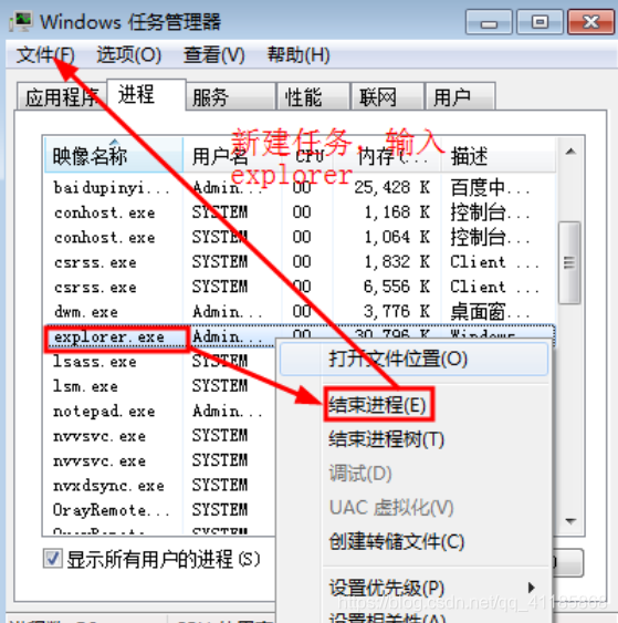选择explorer.exe,结束进程,新建任务,输入explorer即可!