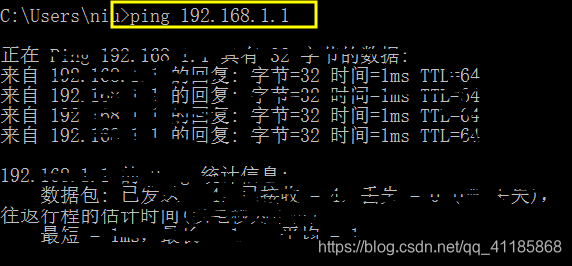 5、输入ping 192.168.1.1 ,检查是否可以ping通网关地址